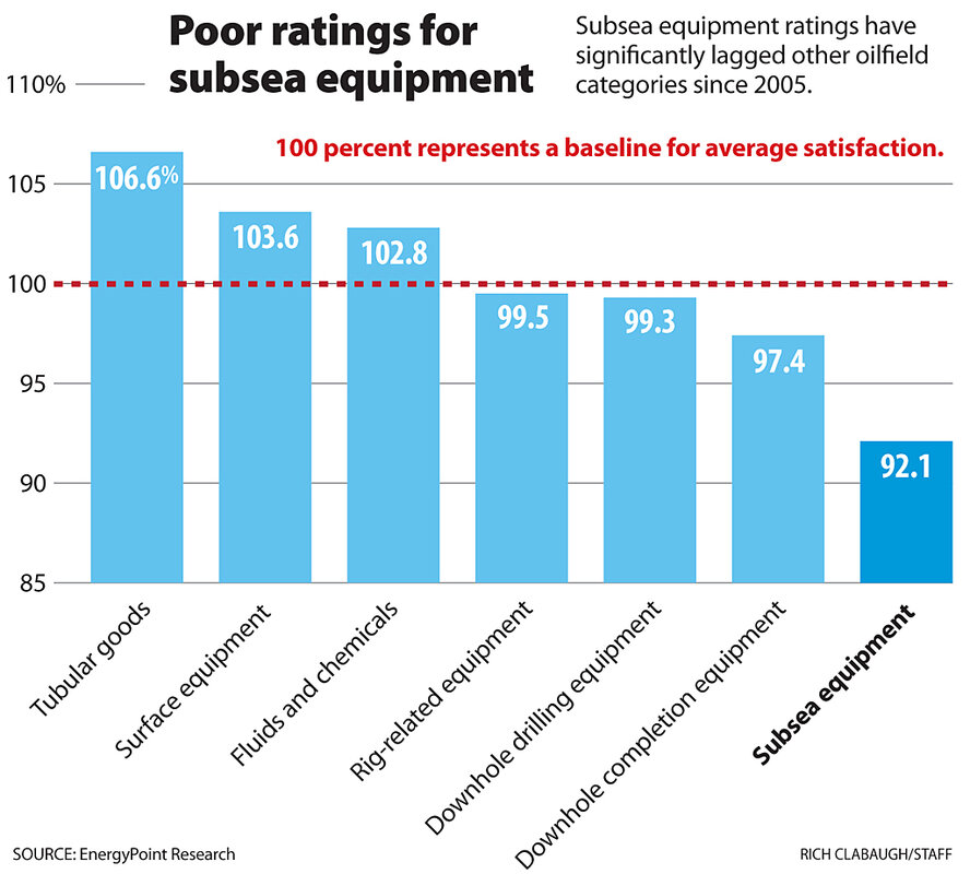 Since 2005, subsea equipment has received the lowest annual overall satisfaction rating of the seven oilfield segments tracked by EnergyPoint. While oil company leaders rated every other equipment category above or just slightly below the average overall industry rating 鈥 defined by the survey company as 100 percent 鈥 subsea equipment scored at 92.1 percent. The next-worst category, downhole completion equipment, scored 5.3 percentage points higher.