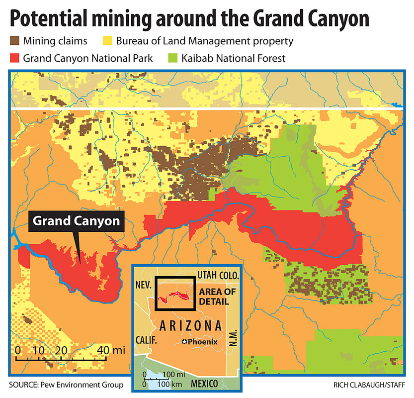 More than 8,300 uranium and other mining claims, their development frozen by the government moratorium, are staked on the public lands near the Grand Canyon, according to a new study by the Pew Environment Group, an environmental watchdog based in Washington, D.C.