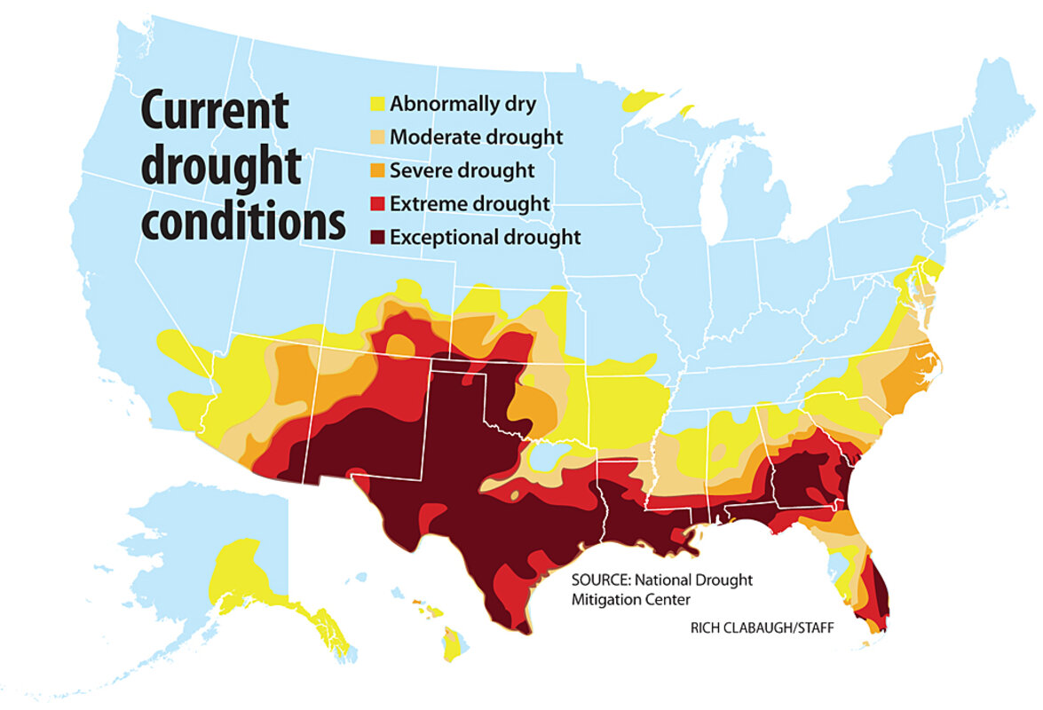 Thus, the southern tier 鈥 from Arizona through northern Florida and Georgia 鈥 has been experiencing droughts ranging from extreme to exceptional (see map).