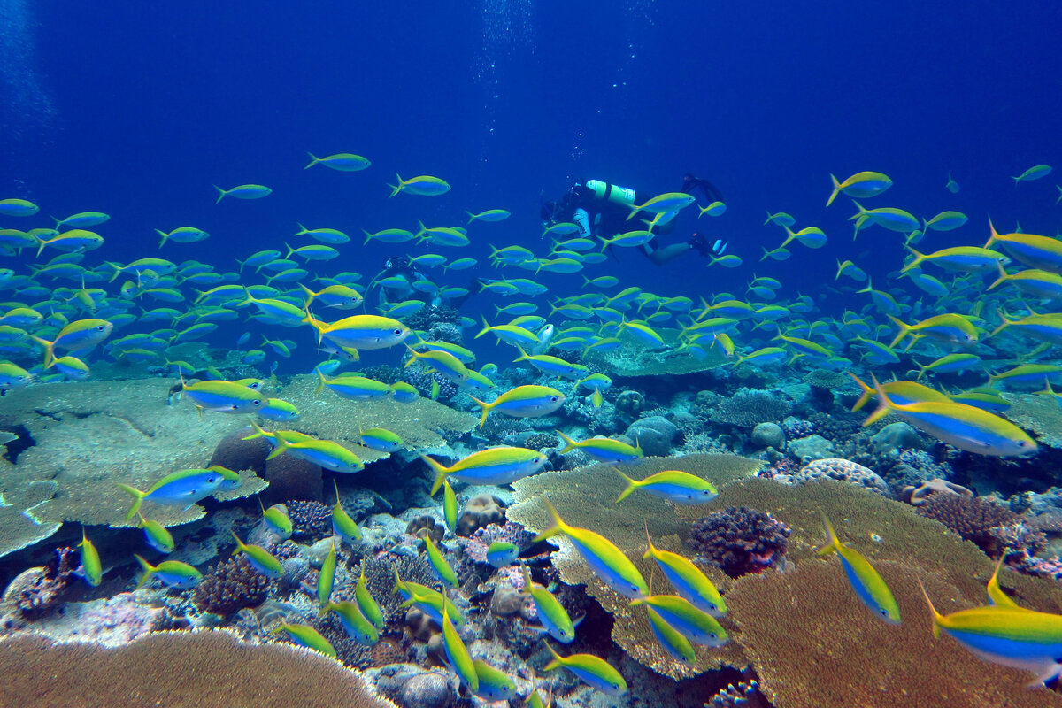 A healthy reef system typically hosts at least 90 percent of that base line, the study shows. With the right mix of species, a reef system can still maintain its full range ecosystem functions with about 500 kilograms of fish per hectare.