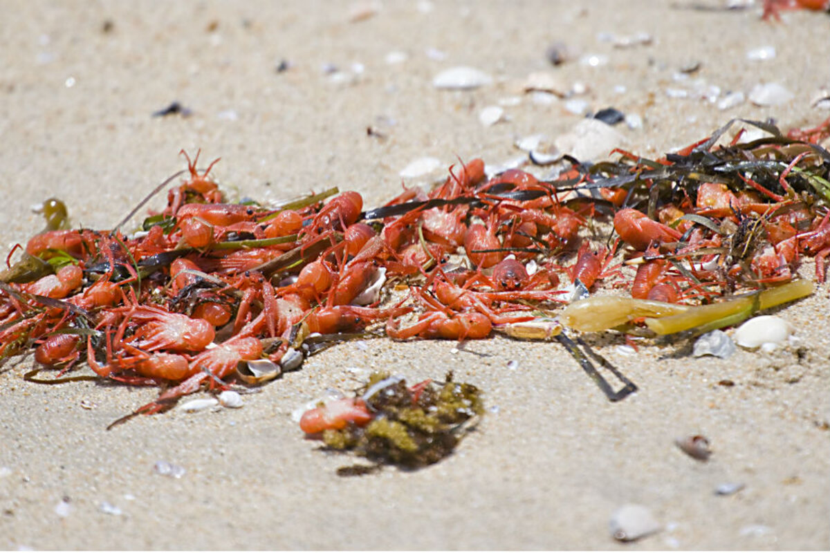 It is not the first assault by these bright red "tuna crabs," which resemble mini lobsters about two inches long. And the thousand or so that washed up on two beaches Wednesday are nothing when compared with last June's incursion of hundreds of thousands all along the coastline.