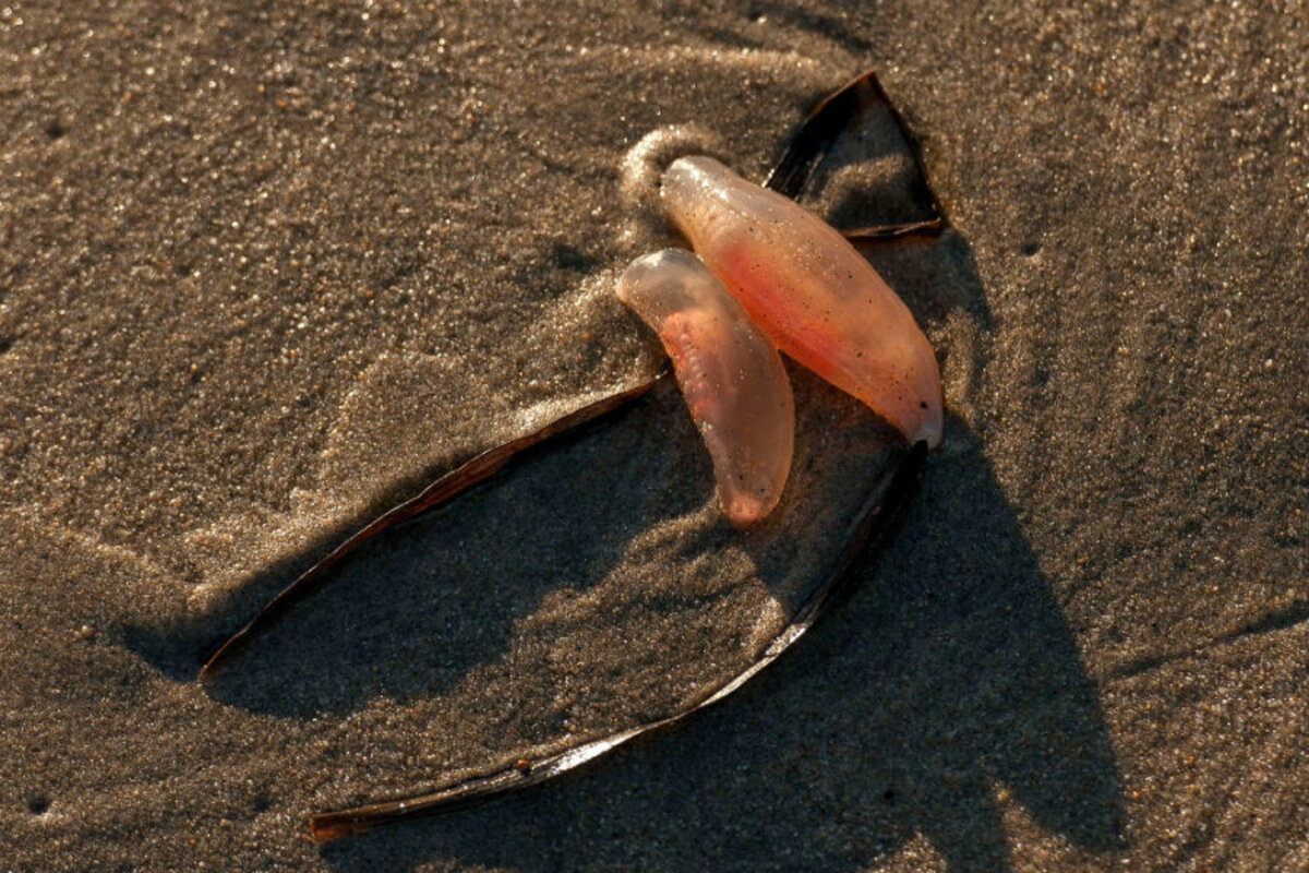 The pinkish gelatinous pods that showed up on the beach on Monday, causing curious passersby to stop and take photos, prompted a wave of speculation on social media from locals wondering just what the mysterious creatures were and how they had gotten there.