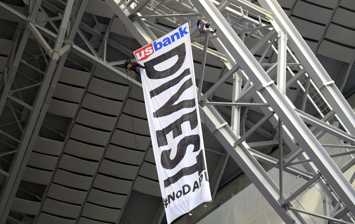 The banner the protesters unfurled urged Minneapolis-based U.S. Bank to divest from the four-state, $3.8 billion pipeline. Opponents contend the pipeline could affect drinking water and Native American artifacts. Texas-based developer Energy Transfer Partners says the pipeline will be safe.