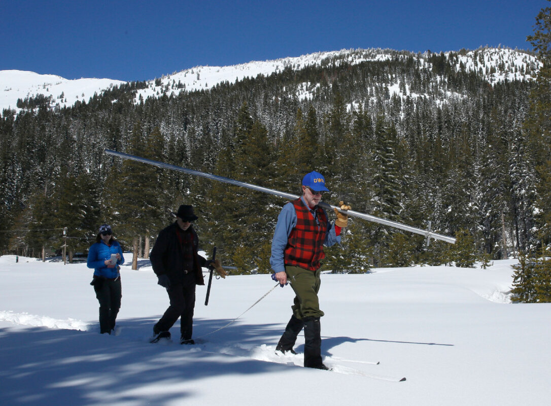 When California鈥檚 chief snow surveyor measured the snowpack near Lake Tahoe on Wednesday, he found 10 feet of snow at a spot that had been barren at the height of the state鈥檚 five-year drought.
