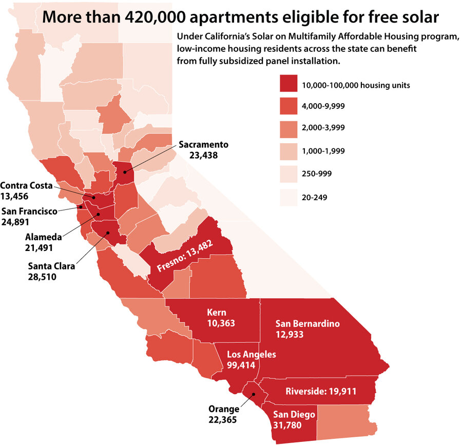 At least 3,500 buildings across the state currently qualify for panel installation under SOMAH, says CPUC solar analyst Tory Francisco, and in these buildings there are almost 255,000 individual rent-assisted units.