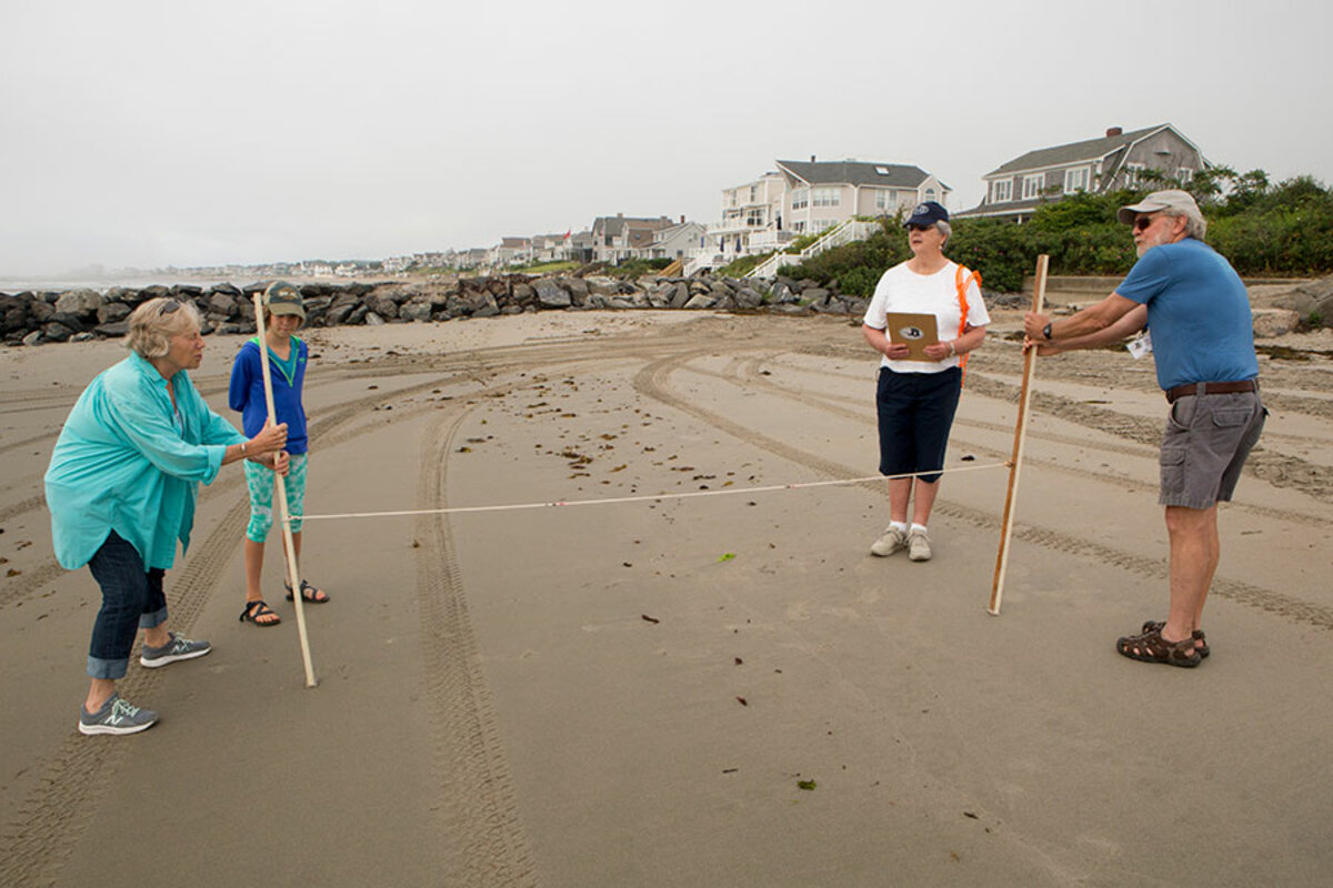 Claudia Gilmartin and Sylvia and Lee Pollock have driven from their homes in Maine to this small beach in Rye, N.H. 鈥 their trunks packed with clipboards, neon stakes, and a rope-yardstick measuring apparatus 鈥 at least once a month for the past two years.