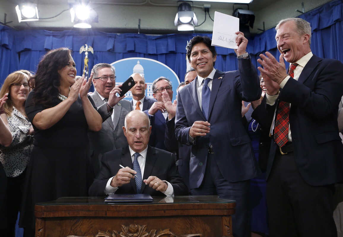 The new law, along with an executive order Brown signed directing California to take as much carbon dioxide out of the air as it emits, represent the latest in a string of ambitious environmental initiatives as California seeks to fill a void left by President Trump's decision to withdraw from the Paris climate accord and his efforts to boost the coal industry.