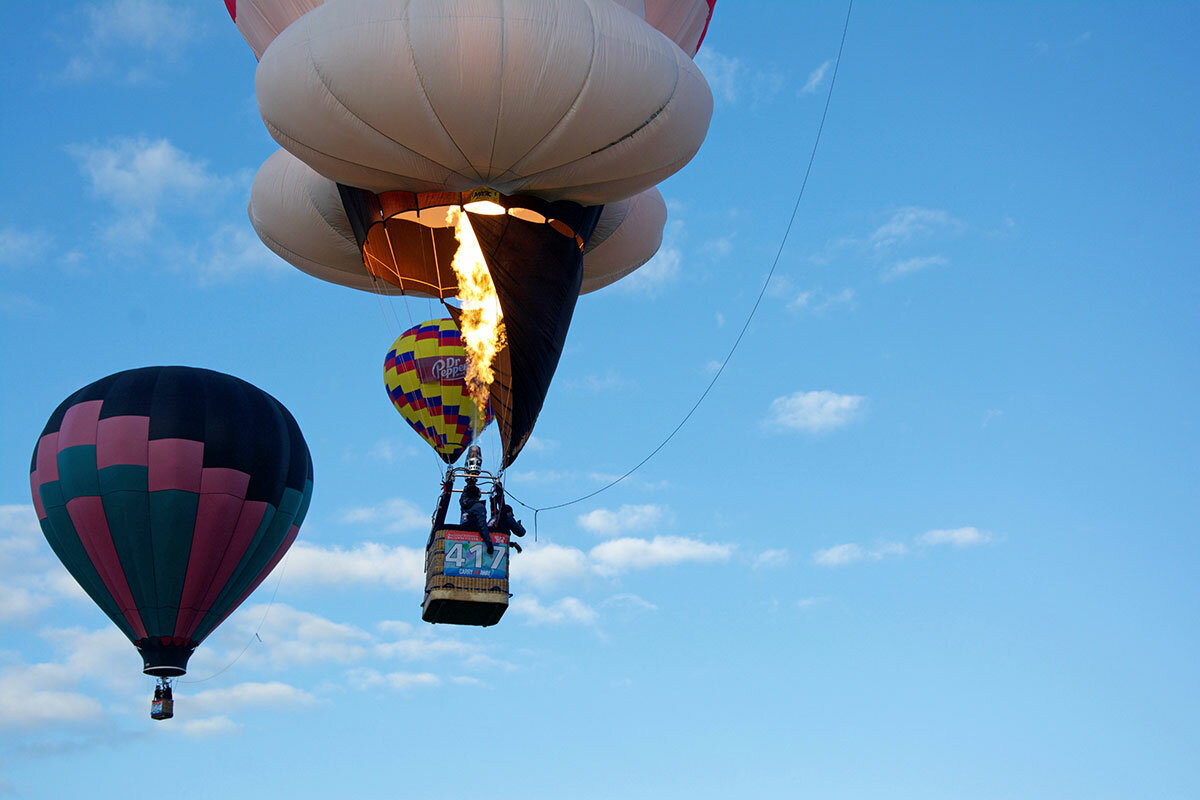 The pilots ascend into the sky by lighting a flame above the gondola, heating the air inside the balloon to rise above the cooler air. Upon reaching a higher altitude, the balloon can hitch a ride on the warmer air currents above the Sandia Mountains and sail north before descending again to catch the low-altitude surface winds and complete a boxlike course.