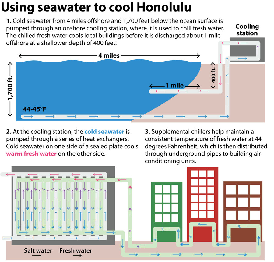 Researchers at the U.S. Marine Corps and the University of Hawai鈥榠 at Ma鈥搉oa as well as private companies are exploring the potential of wave energy. The company Honolulu Seawater Air Conditioning wants to use water pumped from the deep sea to cool buildings in downtown Honolulu, effectively eliminating 1% of the energy demand for the island of Oahu. Another Oahu-based company, Makai, is cultivating a process that uses the temperature differential between cold deep-sea waters and warm surface waters to generate energy.