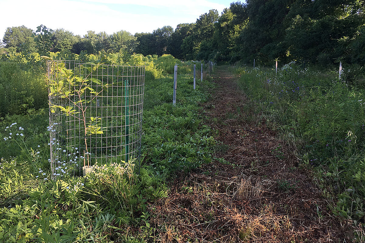 Get closer and it鈥檚 easy to understand why. Rows of overgrown bushes and goldenrod push up to the thin wisps of young chestnut trees, most of which are encircled by wiring or plastic tubes. During the summer, chickens scratch their way down the wide, bumpy rows. Unlike most fields, the ground is not flat. A shaggy mix of grasses, clover, and other ground cover grows between these imprecise alleys of trees and weeds. The chickens themselves are kept in line by portable fencing and rickshaw-like platform coops.