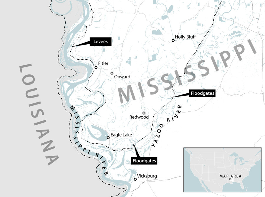 Vicksburg鈥檚 elevation places it well out of the flood zone, but the wedge of land to the north between the Yazoo and Mississippi rivers is flat and low-lying. Today, tall levees line both rivers, constraining them to their channels. Floodgates drain rainwater out of that wedge of land, dubbed the Yazoo Backwater Area.听