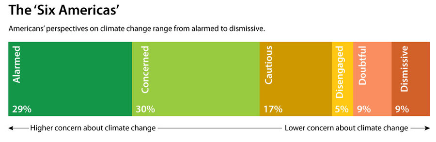 Researchers from and instead break down the spectrum of U.S. perspectives on humanity’s role in climate change into “” – ranging from dismissive (9%) to alarmed (29%, an all-time high). The largest share of the public – 3 out of 10 – are concerned. They see climate change as a serious but distant threat, unlikely to affect them.