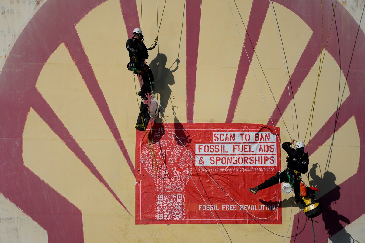 Activists used floating cubes emblazoned with fossil fuel-linked advertisements to block the entrance, along with the protest ship Beluga II, with the words 鈥淏an Fossil Fuel Advertising鈥 strung between its two masts. Activists also climbed a 15-meter (yard) oil tank and attached advertisement posters next to Shell鈥檚 logo.