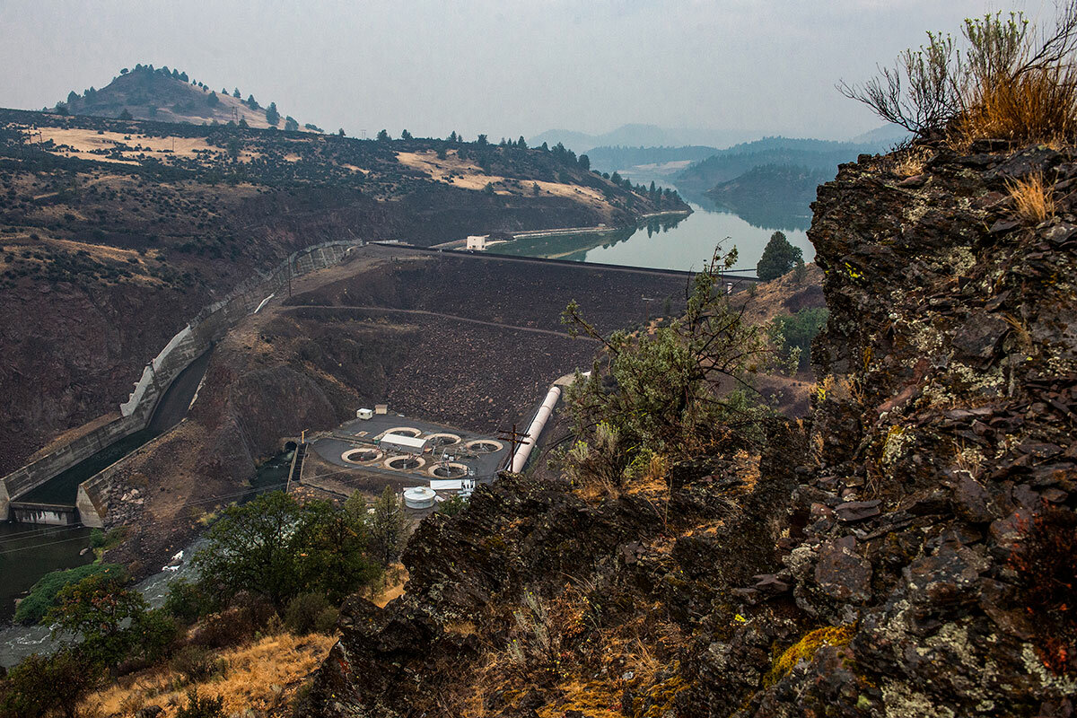 Six dams were built on the Klamath River between 1918 and 1962. The Iron Gate Dam is 173 feet tall. Sluice pipes wind down the face of the dam from the reservoir behind it, ejecting water through two turbines to create hydroelectricity and providing the Lower Klamath a ration of lake-warmed water. Three shorter dams further upriver 鈥 the Copco No. 1, Copco No. 2, and John C. Boyle 鈥 also were built to bring kilowatts to a rural land. 聽 聽