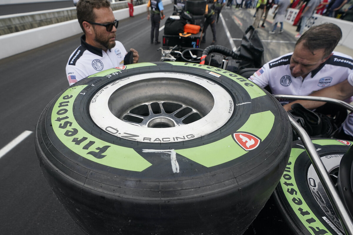 Guayule tires, distinguished by green-painted sidewalls, made their IndyCar debut during the Pit Stop Challenge on Friday. They will get a more significant test at the Music City Grand Prix in Nashville, Tennessee, in August, when IndyCar will use tires made partially of guayule rubber.