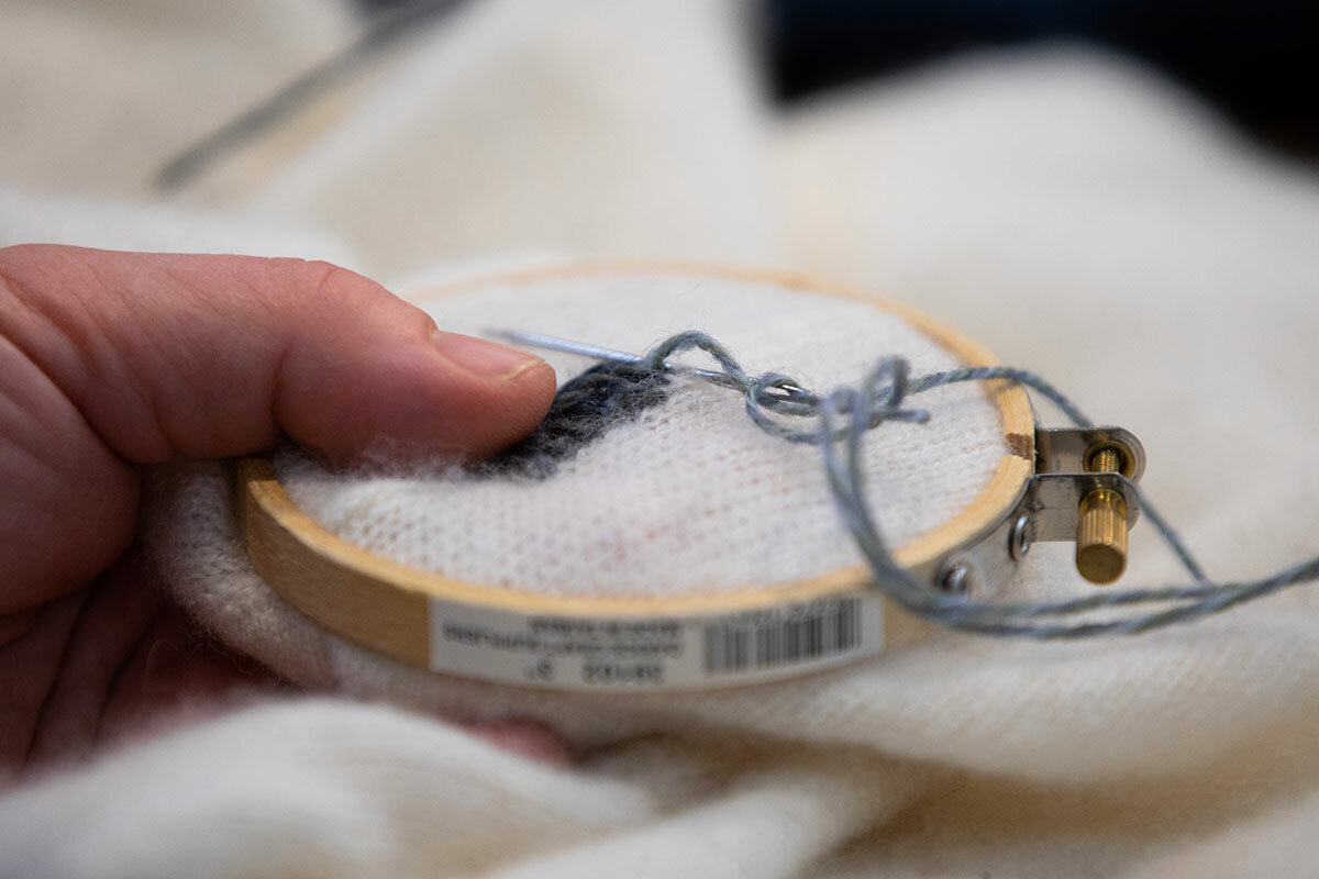 Mending student Ms. Zehler says she is enjoying learning an old practice in addition to having an opportunity to bring her together with other people in her community, a nice balance after several years of Zoom meetings and remote work.
