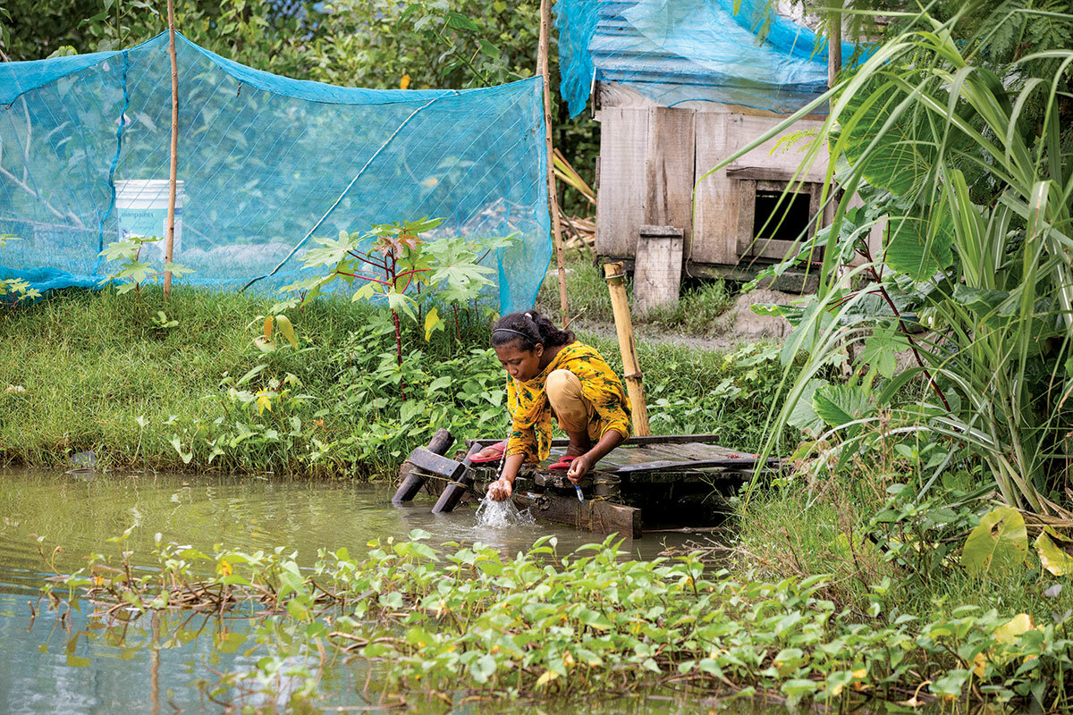 At an informal settlement of 60 homes at the edge of the Pashur River, committee youth member Fahima Begum says her community chose to excavate an old pond about the size of a soccer field. The project is not for aquaculture, an industry that has increased salinity problems amid the labyrinth of ponds and channels of Mongla, but so residents can collect enough rainwater for household cleaning.