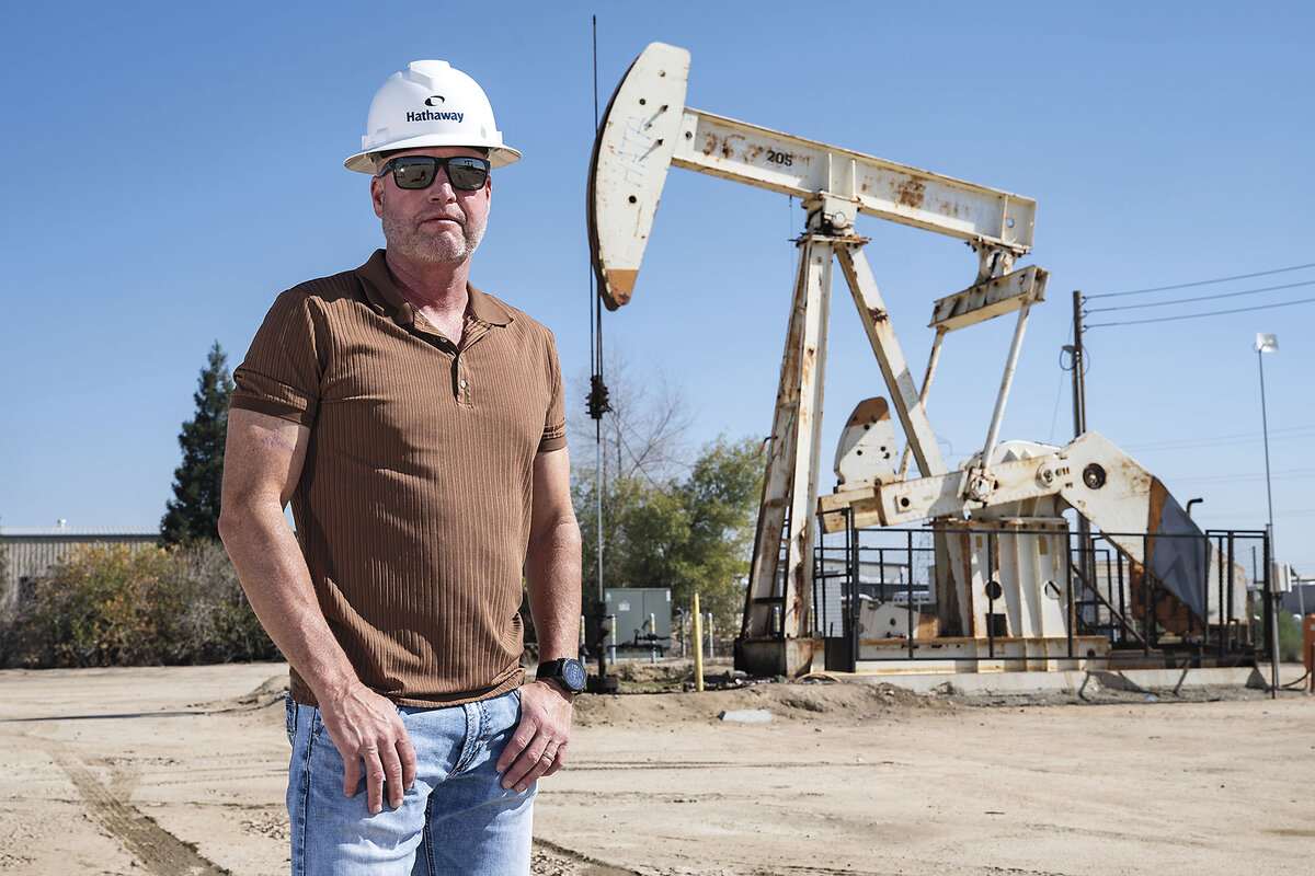 Mr. Hathaway pulls up in his white pickup and uses a shovel to uproot a tumbleweed from the dirt beside a black pumpjack, one of two he operates on this site in Kern County.