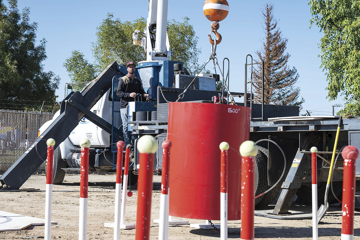 Tyler Weeks steps up to the crane. He鈥檚 been in the industry since 2007 and works for a local contractor. He deftly steers the barrel past the posts without toppling one, but crushes a cone that divides the lanes. After he brings the barrel to a stop and returns to the shade, his fellow crane operators rib him about the cone.聽