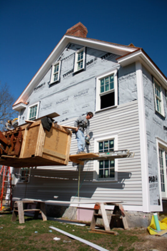 The is on 鈥 although it still needs work, the new have been installed and trimmed, and the carpenters are now busily putting on the cedar clapboard siding.