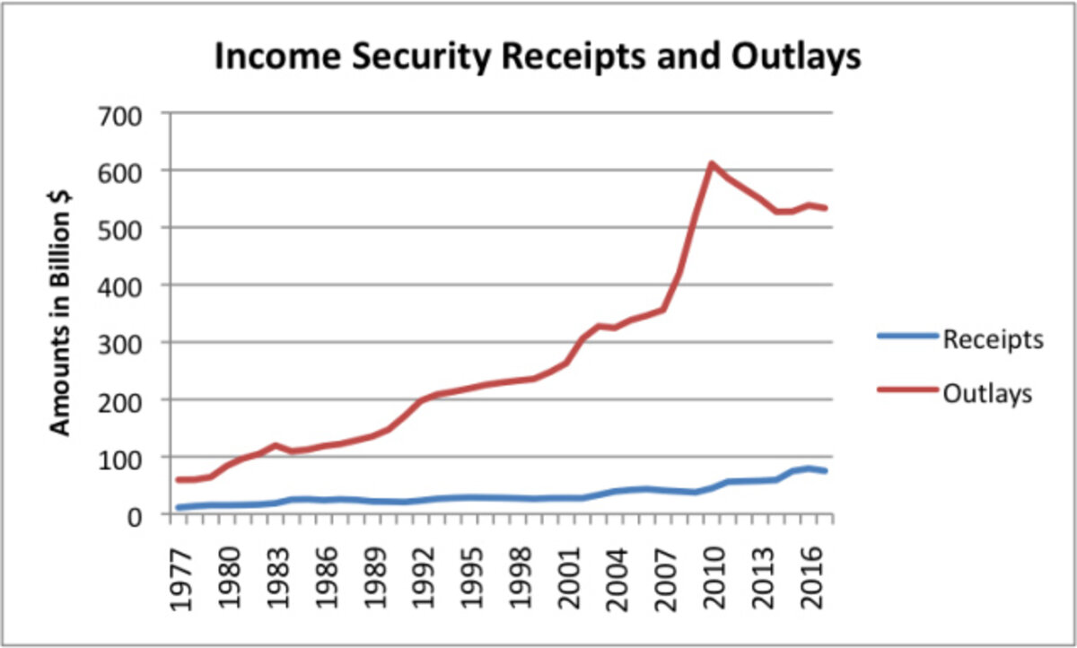 Another grouping on budget reports which has some revenue associated with it is聽Income Security, shown as a functional category on聽. This grouping seems to include the federal portion of unemployment compensation. It probably also includes Food Stamps. It too shows a shortfall.