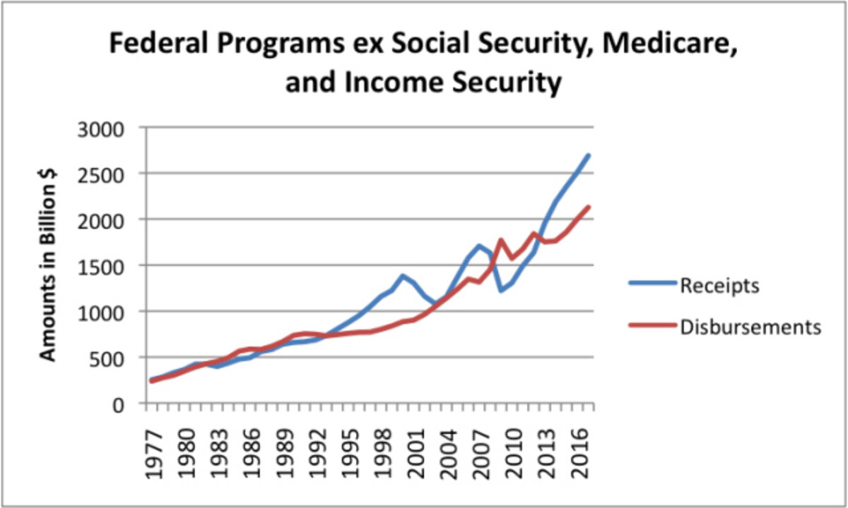 If it were somehow possible to erase the problems with these three programs (Medicare, Social Security, and Income Security), there would still be a federal revenue shortfall, but a manageable one. In several periods, there has been a surplus on this basis (Figure 6).