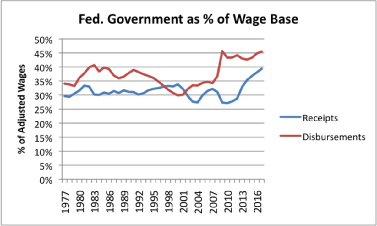 If we use the same wage base as with Figures 1 and 2, the ratios of income and disbursements to wages are as shown on Figure 8 below.