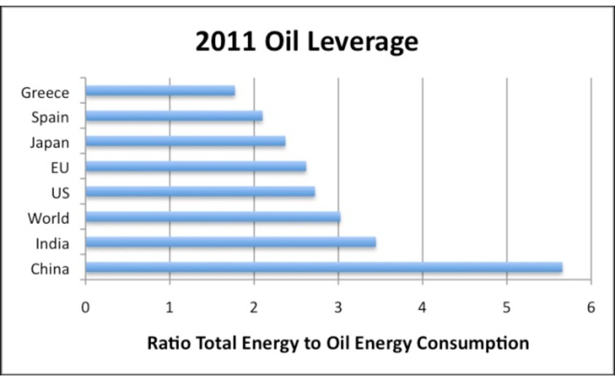 A barrel used in the developed world would 鈥渙nly鈥 be leveraged up by other fuels by roughly a factor of 2.0 to 2.75, and some of this leveraging would be hydroelectric or nuclear electric, which is fairly benign from a carbon dioxide point of view. If that same barrel of oil is instead used by China, it can be leveraged up by a factor of 5.7. Thus a barrel of oil saved by the developed world can be transferred to China and used to greater positive effect, from the point of view of producing cheap consumer products and a greater negative impact, from the point of view of CO2 impact.