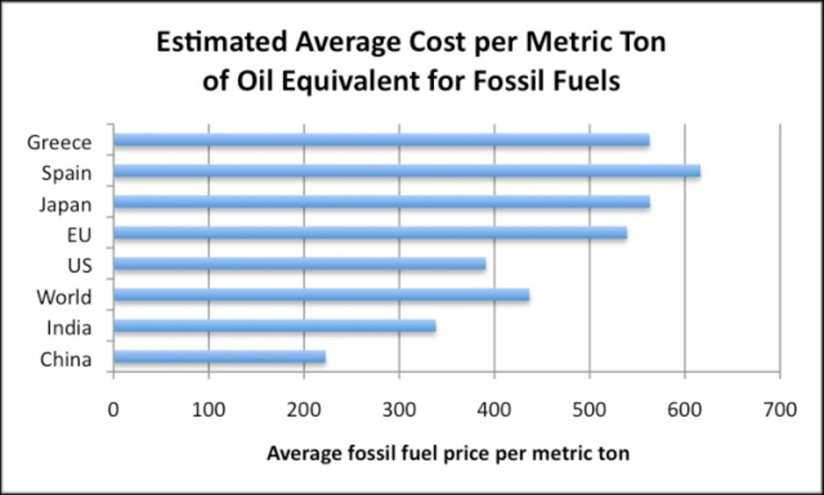 The Figure 5 averages include only fossil fuels (coal, oil, and natural gas), and exclude other fuels such as nuclear, hydroelectric, wind, and solar PV. Fossil fuels represent 92%-93% of energy supply in China and India, based on聽聽data. In Europe, fossil fuels represent 79% of total fuels; in the US and Japan, they represent 86% to 87% of the total.
