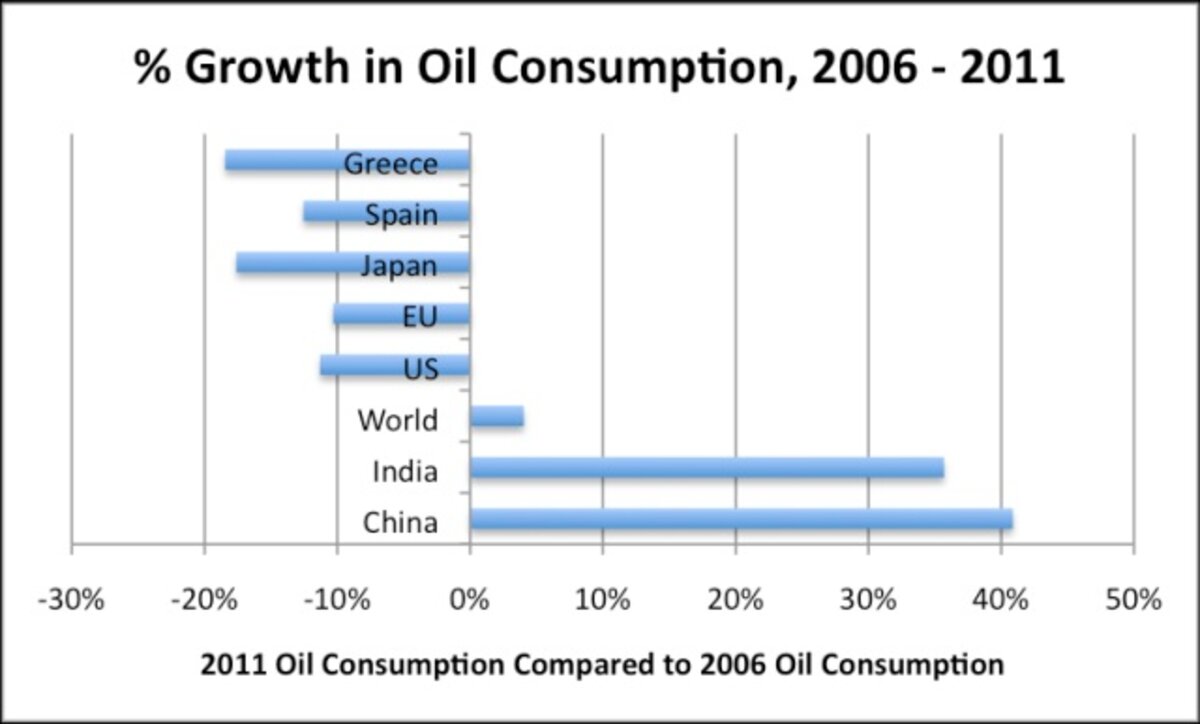 Oil consumption is decreasing in the countries with relatively slow GDP growth, and increasing in India and China (click on Figure 6, above left).