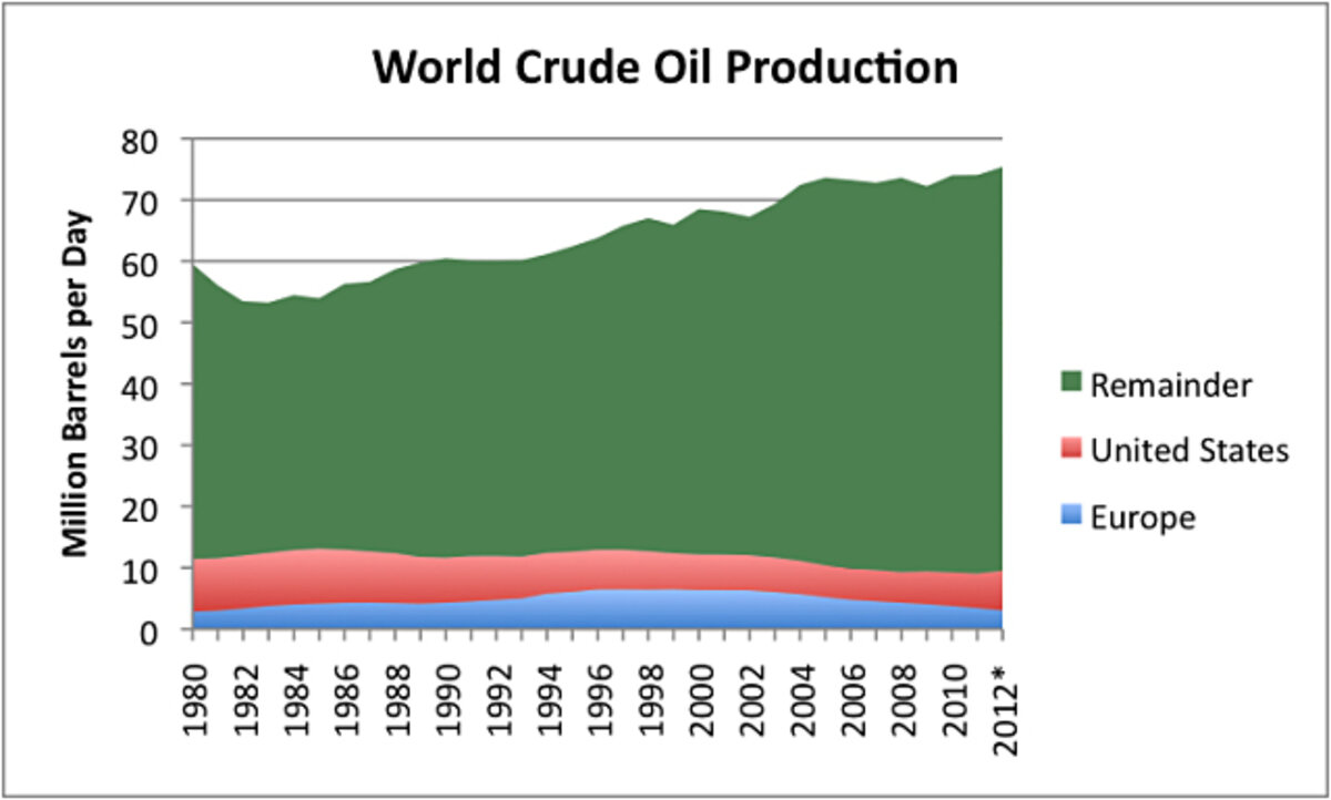 罢丑别听聽is that US oil production is having a huge impact on world oil production. If a person looks at the numbers, world oil production is close to flat. Rising US production makes up for falling European production, but doesn鈥檛 do a whole lot more.