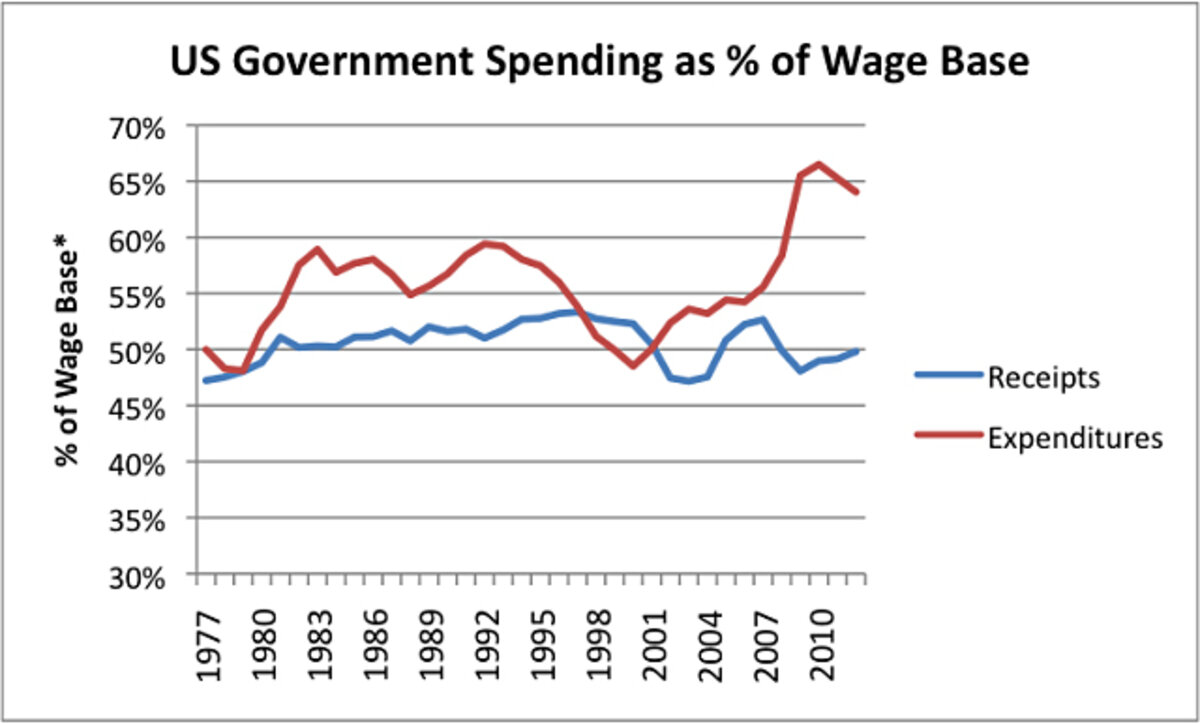 If we use the wage base from Figure 2, the amount of government outgo vs income (all levels, not just federal) is as follows: