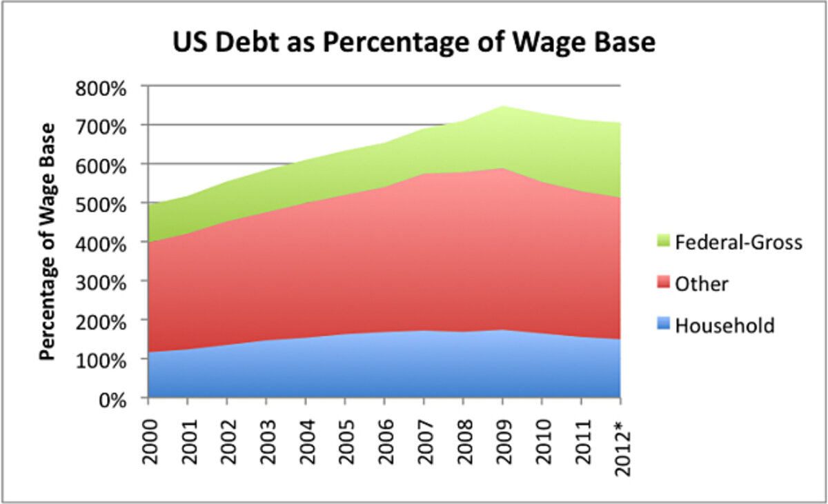 Government debt is in now more than household debt of all kinds, including mortgage, credit card, auto, and student loans. It is close to two times the wage base used in this analysis.