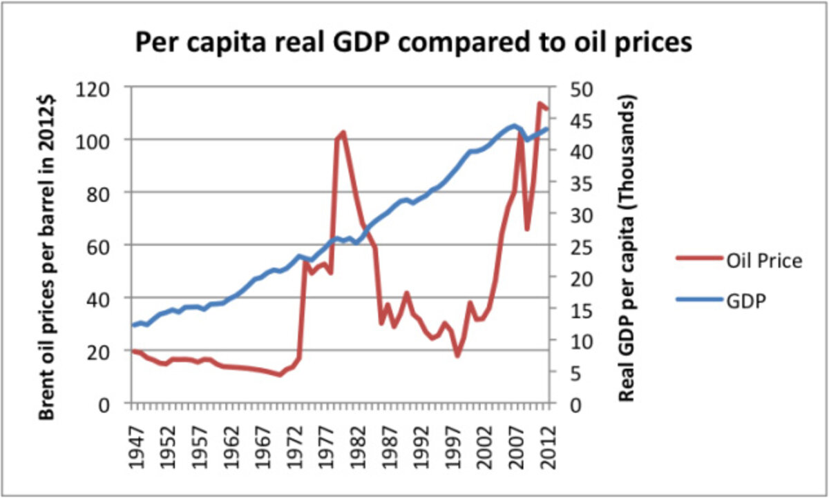If we compare per capita real (that is, inflation-adjusted) GDP with oil prices (both in 2012$), this is what we see: