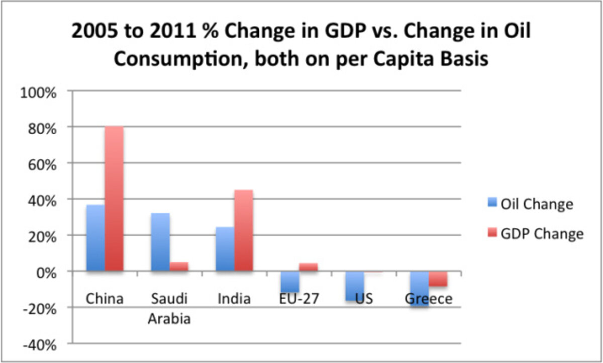 In Figure 1, we see that for several groupings, the increase (or decrease) in oil consumption tends to correlate with the increase (or decrease) in GDP. The usual pattern is that GDP growth is a little greater than oil consumption growth. This happens because of changes of various sorts: (a) Increasing substitution of other energy sources for oil, (b) Increased efficiency in using oil, and (c) A changing GDP mix away from producing goods, and toward producing services, leading to a proportionately lower need for oil and other energy products.