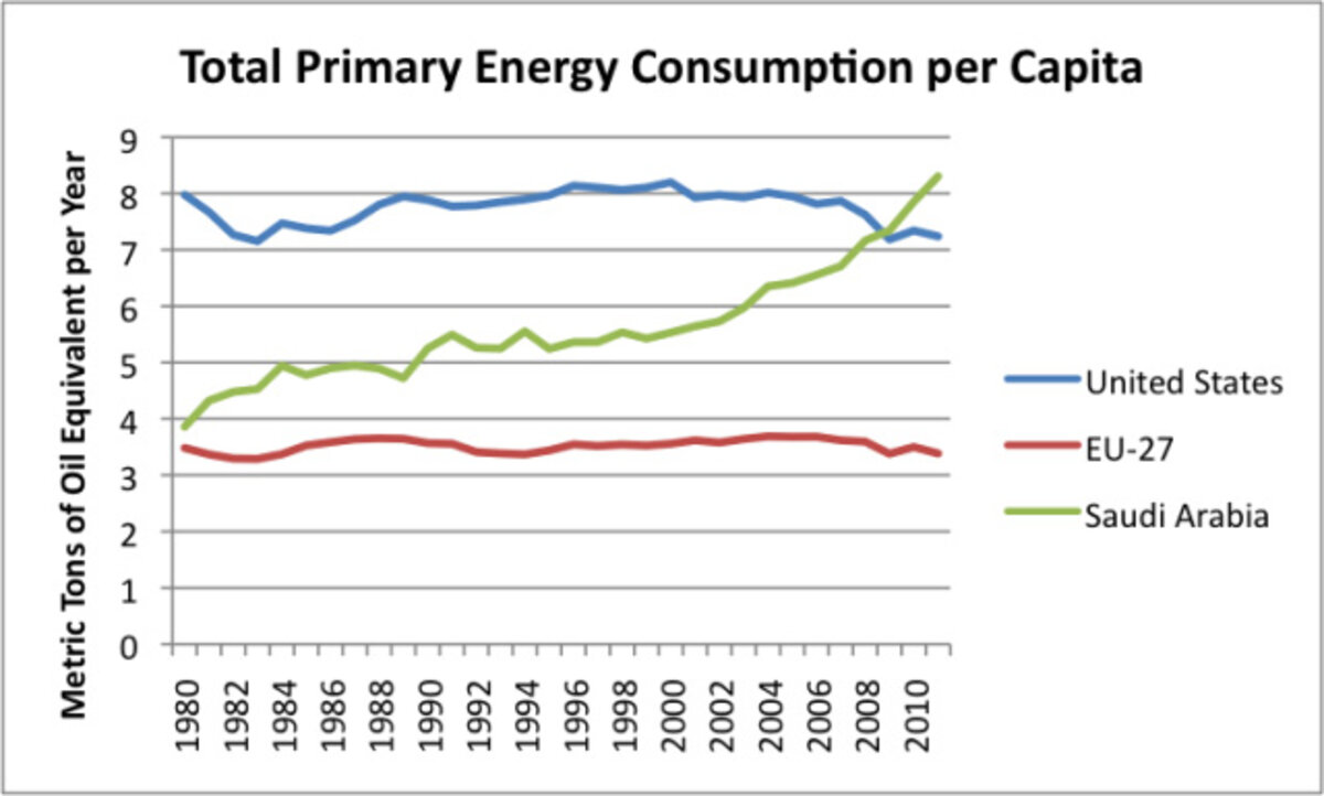 The situation is strikingly different for Saudi Arabia, however. A huge increase in oil consumption (Figure 1), and in fact in total energy consumption (Figure 2, below), does not seem to result in a corresponding rise in GDP.