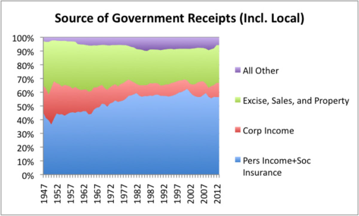 The only portion that is entirely from corporations is corporate income taxes, shown in red. This has clearly shrunk by more than half. Part of the green layer (excise, sales, and property tax) is also from corporations, since truckers also pay excise tax on fuel they purchase, and businesses usually pay property taxes. It is clear, though, that the portion of revenue coming from personal income taxes and Social Security and Medicare funding (blue) has been rising.