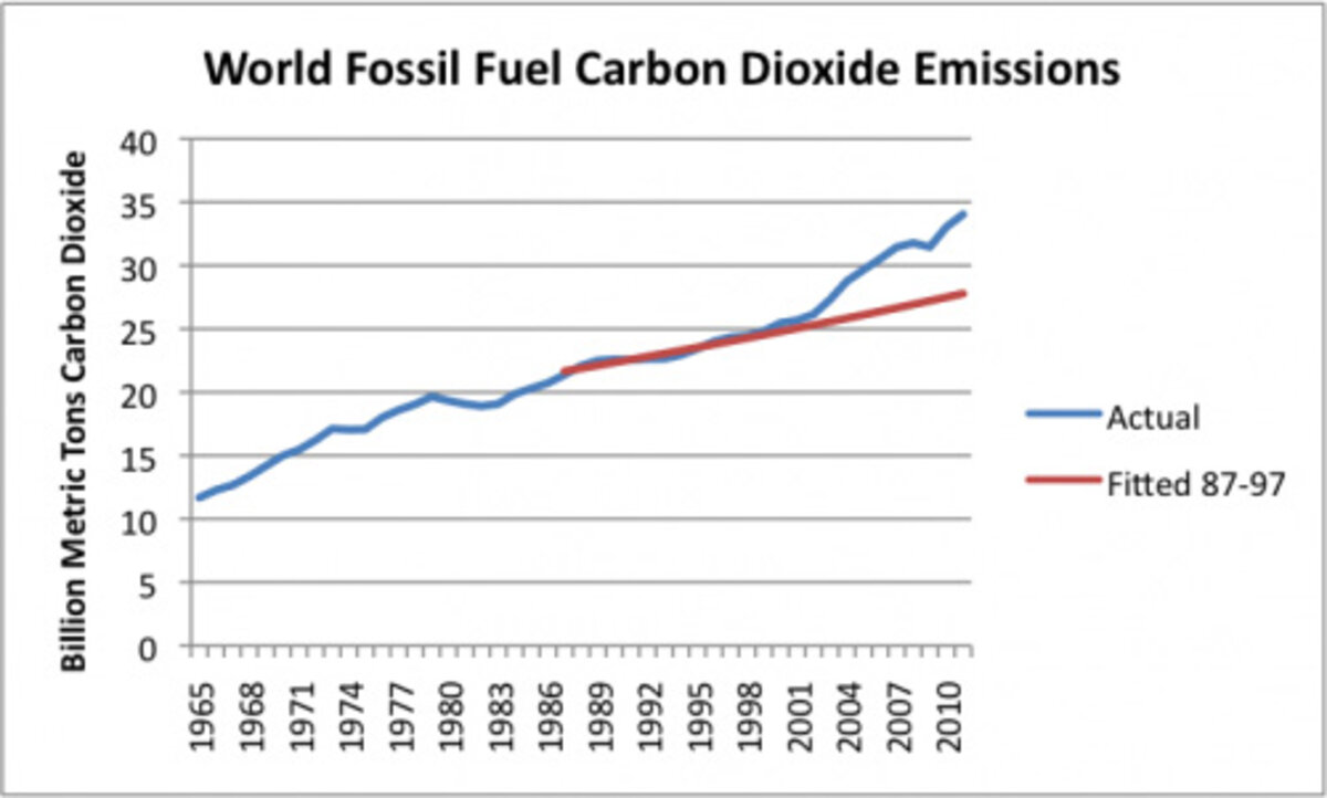 2. Globalization increases world carbon dioxide emissions.听If the world burns its coal more quickly, and does not cut back on other fossil fuel use, carbon dioxide emissions increase. Figure 3 shows how carbon dioxide emissions have increased, relative to what might have been expected, based on the trend line for the years prior to when the Kyoto protocol was adopted in 1997.