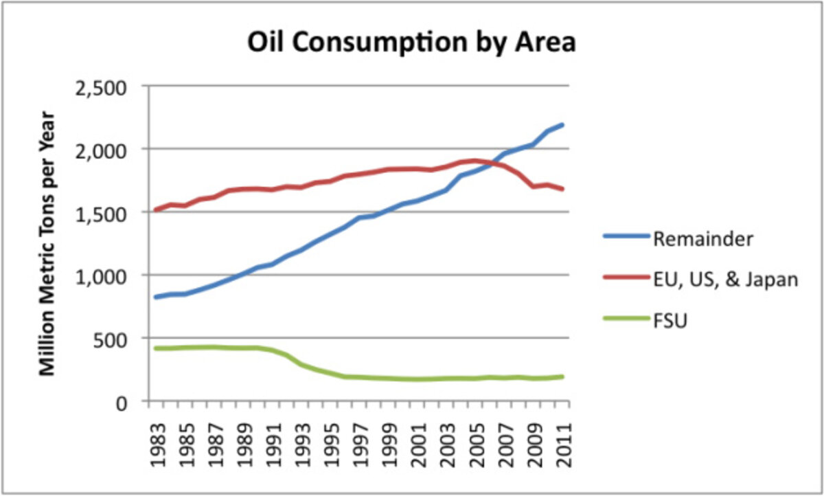 Developing countries are better able to use higher-priced oil than developed countries. 听In some cases (particularly in听oil-producing countries) subsidies play a role. In addition, the shift of manufacturing to less developed countries increases the number of workers who can afford a motorcycle or car. Job loss plays a role in the loss of oil consumption from developed countries鈥搒ee my post,听听The real issue isn鈥檛 better mileage; one major issue is loss of jobs.