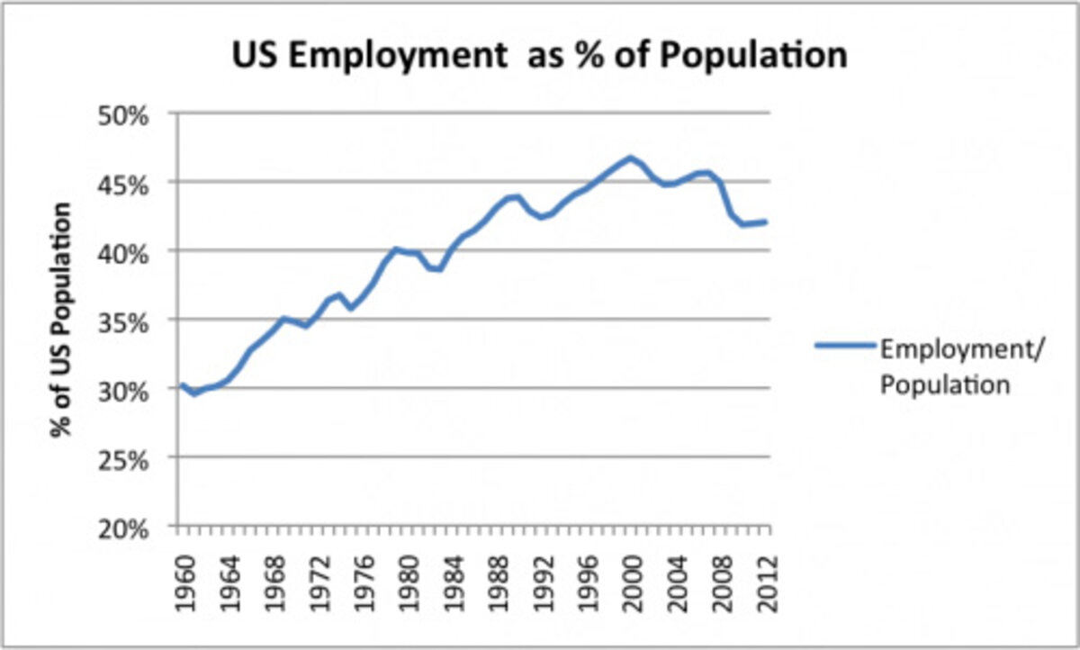 6. Globalization transfers jobs from developed countries to less developed countries.听Globalization levels the playing field, in a way that makes it hard for developed countries to compete. A country with a lower cost structure (lower wages and benefits for workers, more inexpensive coal in its energy mix, and more lenient rules on pollution) is able to out-compete a typical OECD country. In the United States, the percentage of US citizen with jobs started dropping about the time China joined the World Trade Organization in 2001.