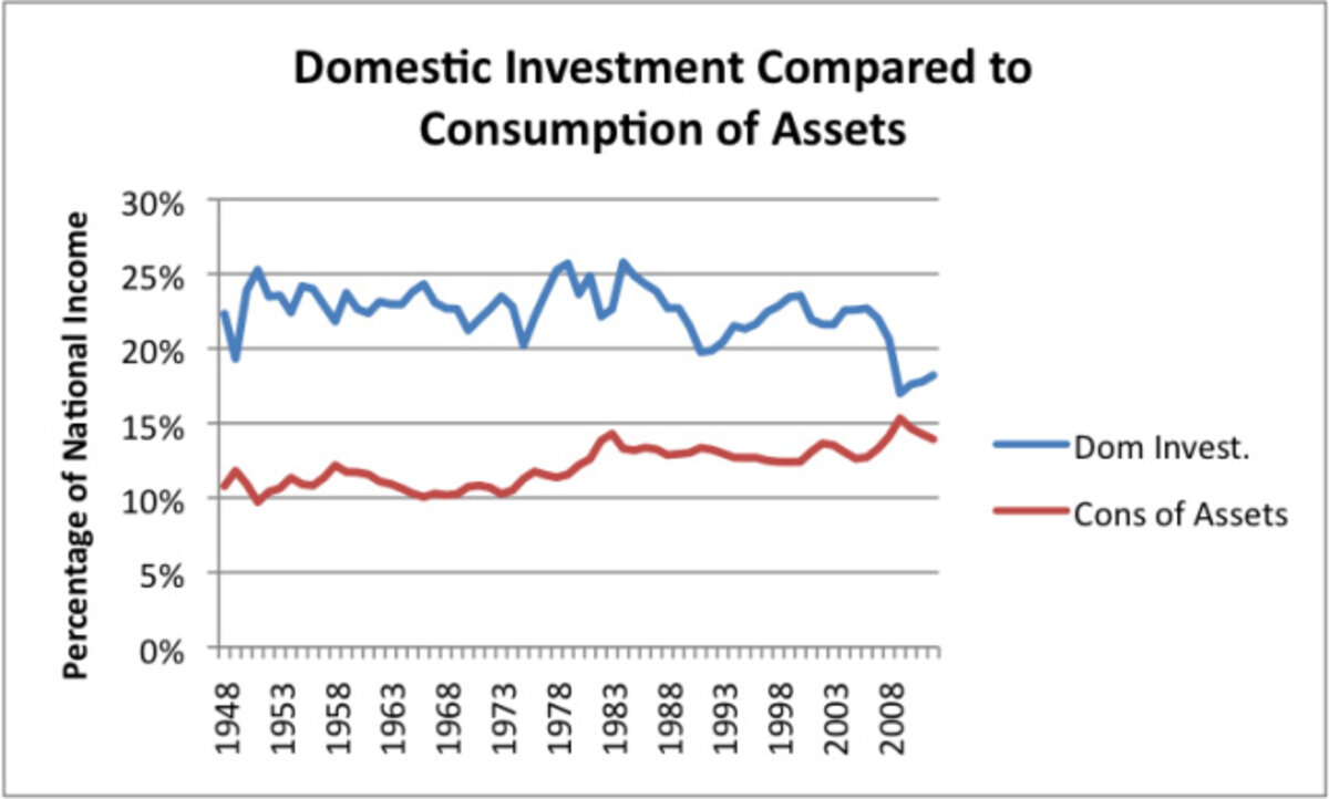 In the US, domestic investment was fairly steady as a percentage of National Income until the mid-1980s (Figure 9). In recent years, it has dropped off and is now close to consumption of assets (similar to depreciation, but includes other removal from service). The assets in question include all types of capital assets, including government-owned assets (schools, roads), business owned assets (factories, stores), and individual homes. A similar pattern applies to business investment viewed separately.