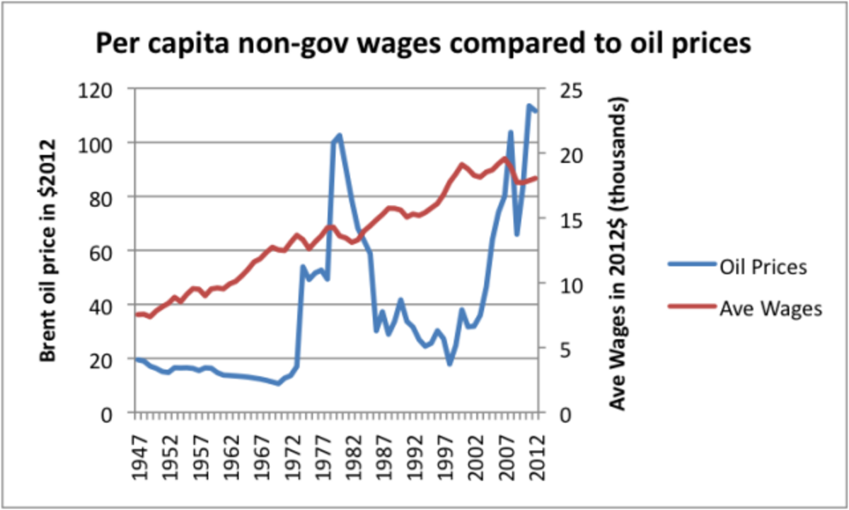 The thing that is striking about Figure 4 is that a similar pattern occurs in the 1973 to 1983 period as the 2002 to 2012 period. Oil prices were high in both periods. (Figure 10, below). In fact, the vast majority of wage growth has occurred when oil prices were $30 or less in 2012$.