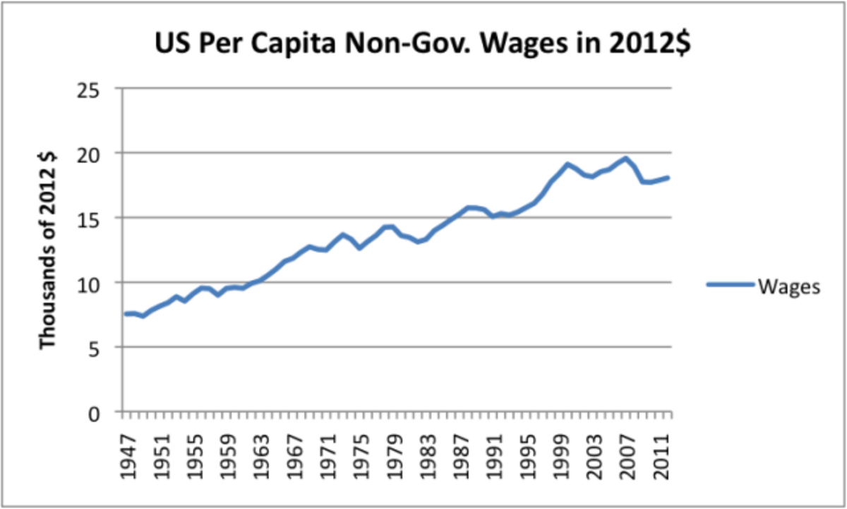 [1] As background for those who have not read my post聽, wages recently have been depressed, in part because fewer people are working. Figure 4 above, showing 鈥淧er Capita Non-Government Wages,鈥 provides a measure of how wages have changed. This is calculated by taking wages for all US residents, subtracting wages of government workers, and dividing by the total US population (not just the number working). The average wage calculated in this manner is than adjusted to the 2012 price level based on the CPI-Urban price index.聽Government workers have been omitted because I am trying to get at the base from which other funding comes. Government wages are ultimately paid by taxes on workers in private companies.