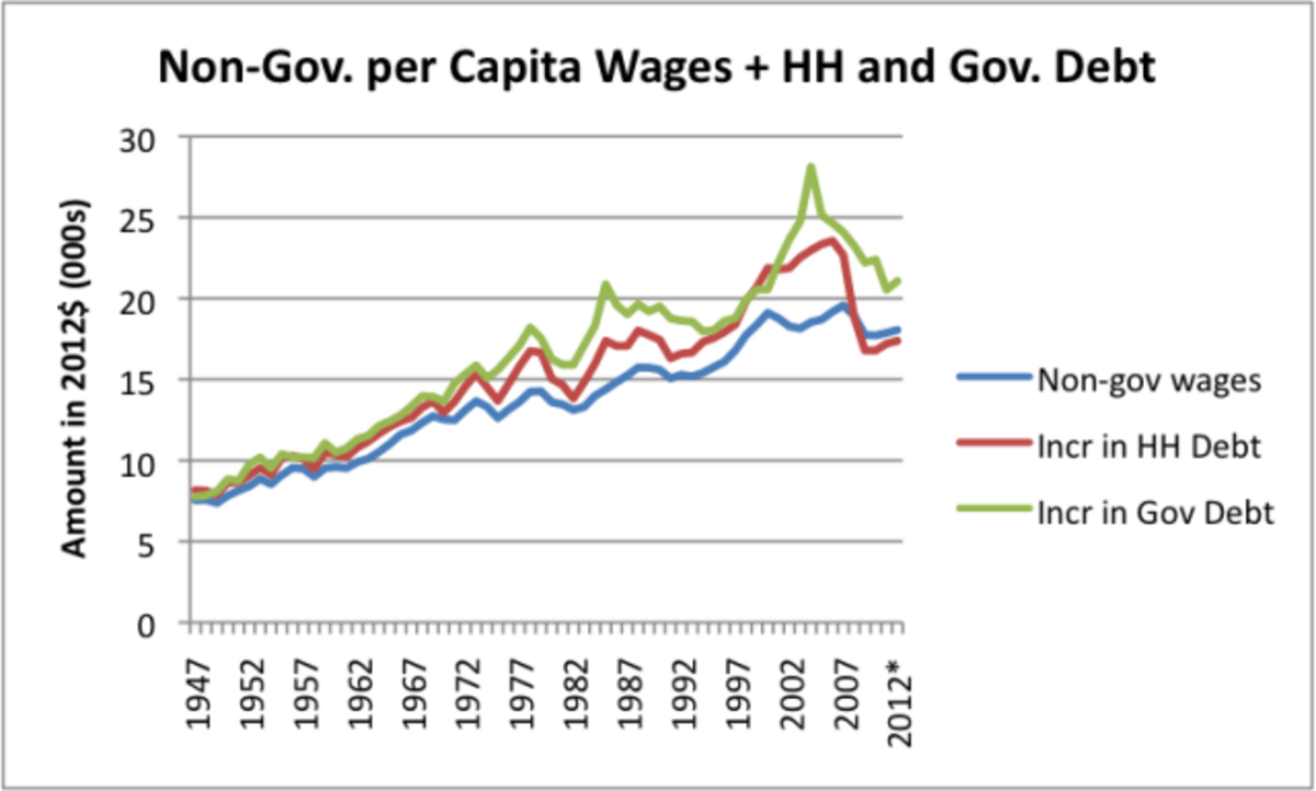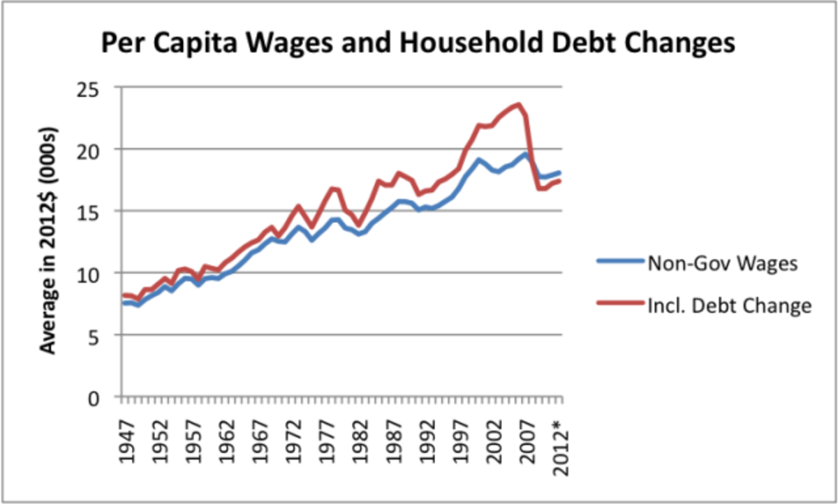 If we add the聽increase in household debt聽(mortgages, credit cards, student loans, car loans, etc.) to wages, this is the pattern we see historically. (The increase has been adjusted for inflation using CPI-Urban):