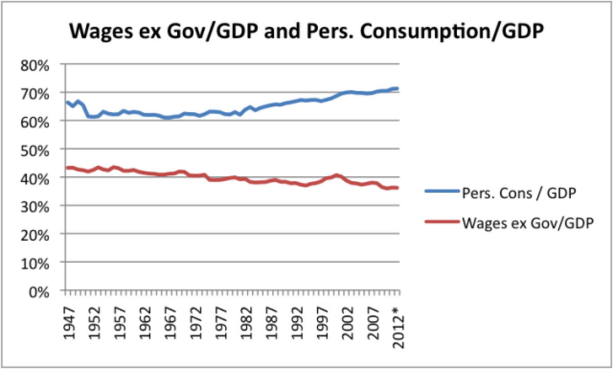 Strangely enough, wages excluding governmental wages have been falling as a percentage of GDP during the same period. How can wages be falling at the same time personal consumption is rising? I think that a large part of the 聽answer may very well be 鈥渋ncreasing debt.鈥