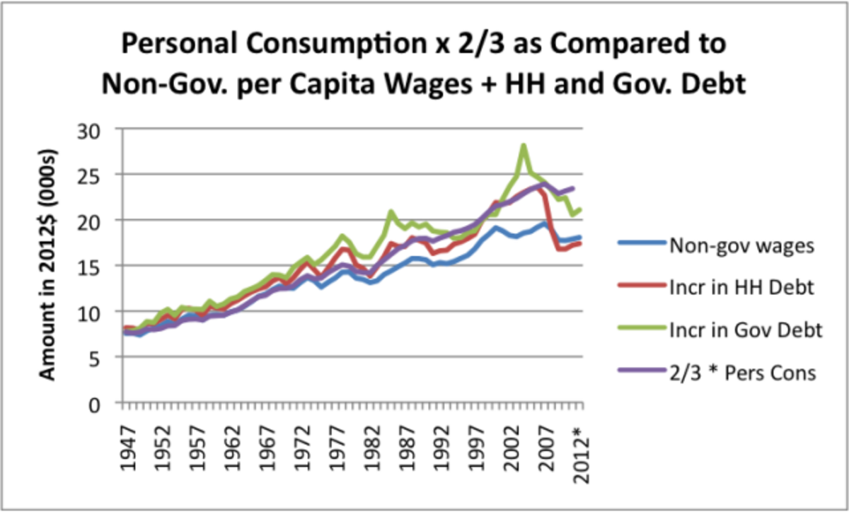 If we compare wages to personal consumption expenditures, we find that wages were about 2/3 of personal consumption expenditures at the beginning of the period graphed, but gradually fell to a lower and lower share of Personal Consumption Expenditures.3 聽If we add a line to Figure 6 showing 2/3 of personal consumption expenditures, the line comes out very close to where we might guess it would, if all of household debt increases, and part of government debt increases were acting to increase personal spending (Figure 8).