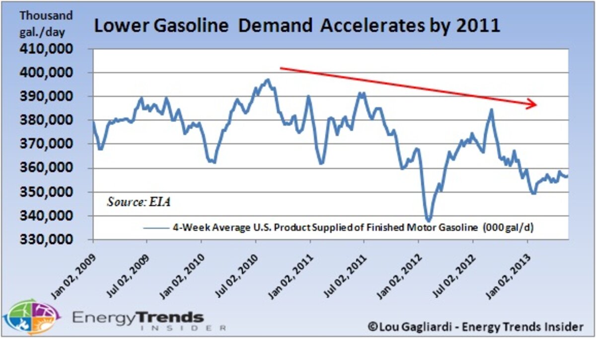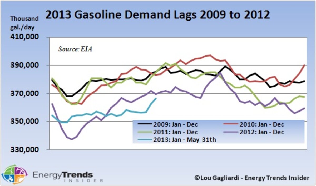 Not only has gasoline demand been weak since 2009, it has been successfully lower roughly each year to year the date in 2013. Within the last month gasoline retail sales have moved upward, whether we see this 2013 trend pass above 2012 remains to be seen. For now, clearly demand in 2013 remains below previous years.