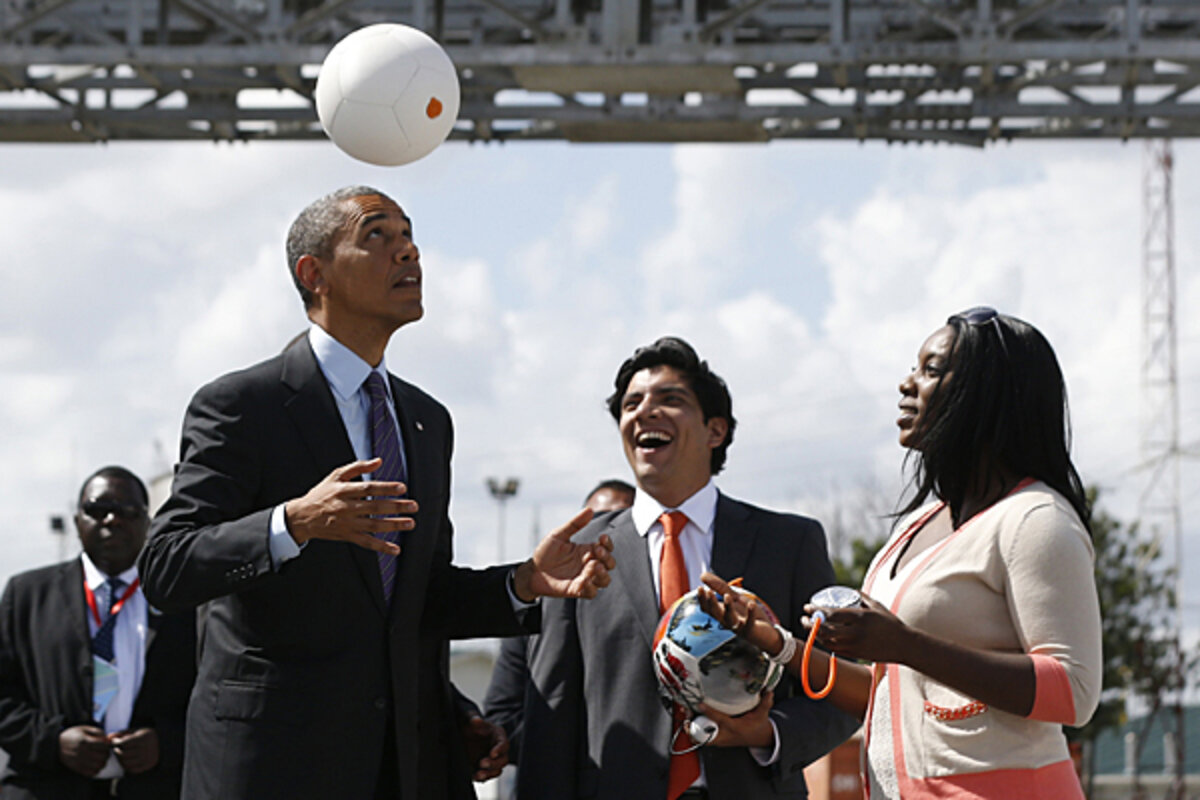 After Obama kicked the ball into the air and bounced it off of his head, he helped attach opposite ends of a cable to the ball and a cellphone. In a speech afterwards, he outlined his "Power Africa" plan, which aims to double access to power in the world's poorest continent.聽