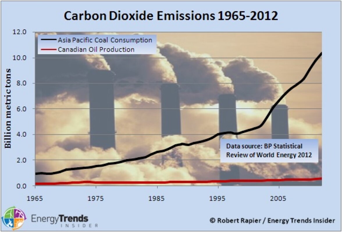 The following graphic illustrates what I consider to be the real problem, and why I consider the focus on Keystone XL to be seriously misplaced. This graphic (see figure 1 at left) shows the carbon dioxide emissions resulting from coal consumption in the Asia Pacific region, compared to the carbon dioxide emissions that would result from burning 100% of Canada鈥檚 oil production.