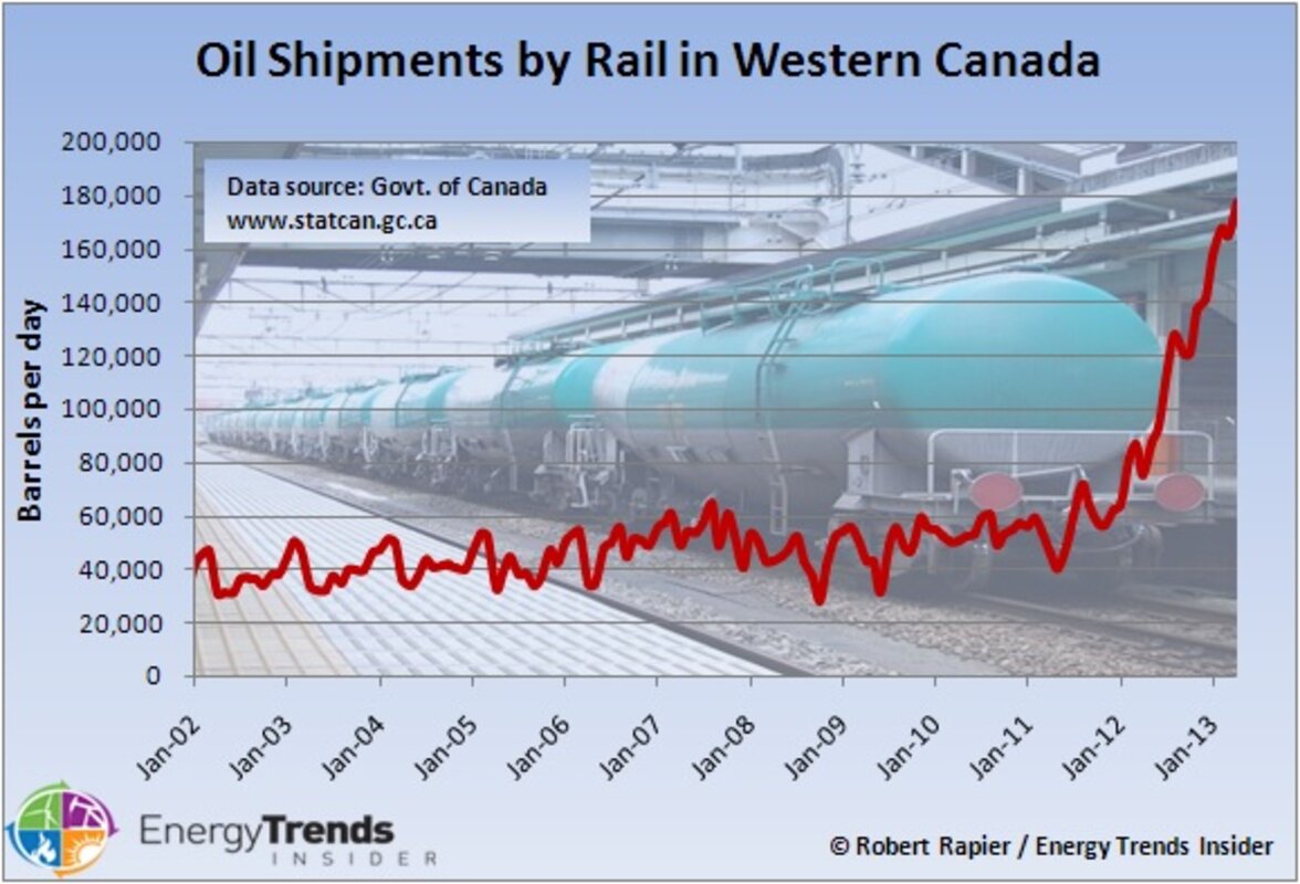 The future of oil sands development depends not on whether Keystone XL is approved. It depends on a sustained high price for waterborne crudes. With heavy Canadian oils trading at a greater than $40/bbl discount to Brent in 2012, it鈥檚 no wonder that rail transport of oil in western Canada is also skyrocketing. Over the past two years 鈥 from the April 2011 through April 2013 鈥 the volume of oil shipped by rail in western Canada nearly quadrupled, rising from less than 46,000 bpd to more than 177,000 bpd.